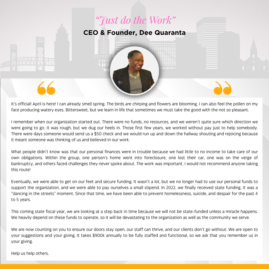 Here in Florida, we serve the second-largest population of women veterans in America, with Duval County as the largest in the state of Florida. We sincerely believe in our Core Mission to help set the standard for providing personalized care and emergency resources to the women who have served and continue to serve our country.