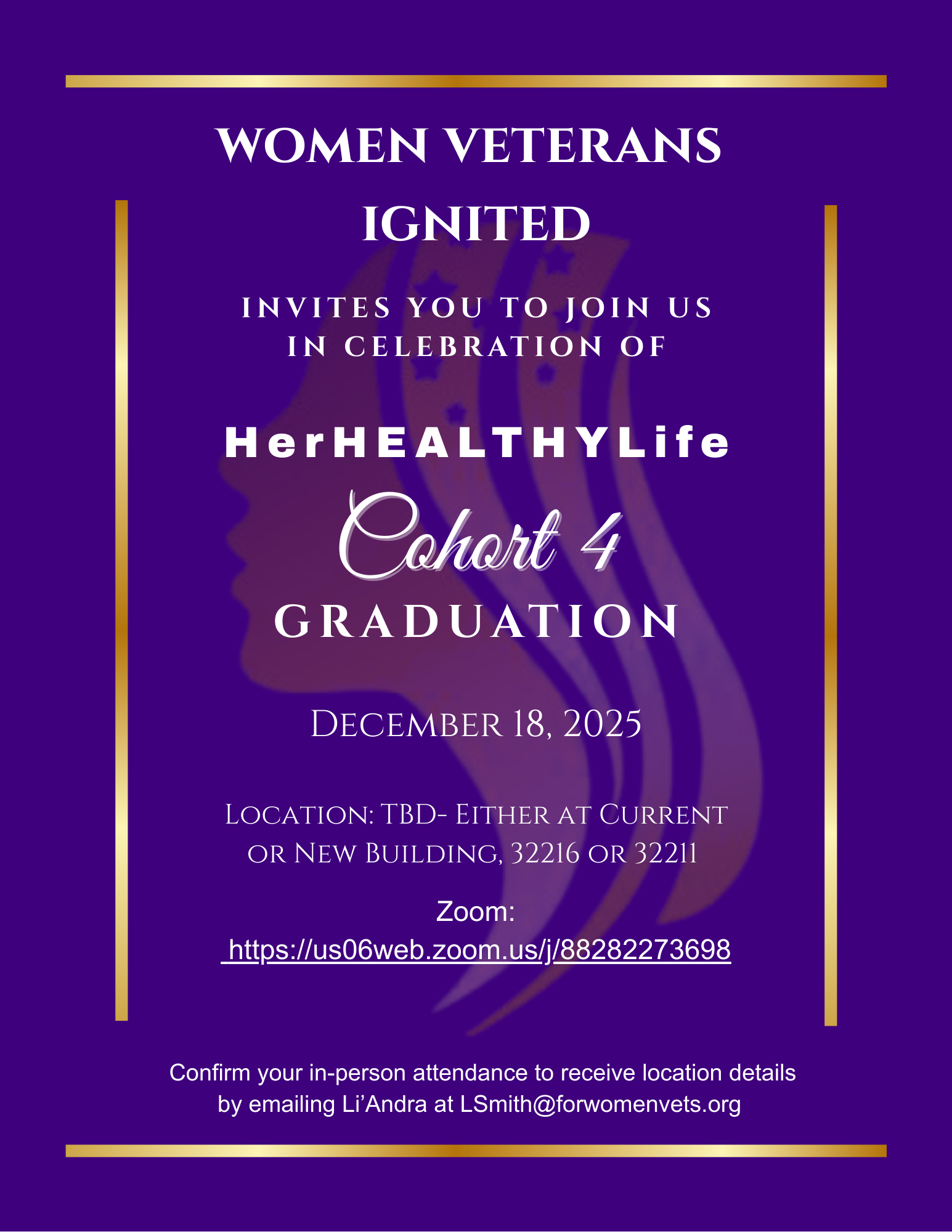 Join us for HerHEALTHYLife Cohort 4 Graduation via Zoom: https://us06web.zoom.us/j/88282273698 or in person. For location details, please email Li’Andra at LSmith@forwomenvets.org. The event will take place either at our current office or at our new space just five minutes away, so no need to worry about extra travel. You can also reach Li’Andra by phone at our office at (904) 862-6039.