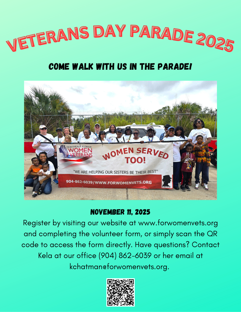 Have questions? Please call our office at (904) 862-6039 and ask to speak with Kela. You may also email her at kchatman@forwomenvets.org.