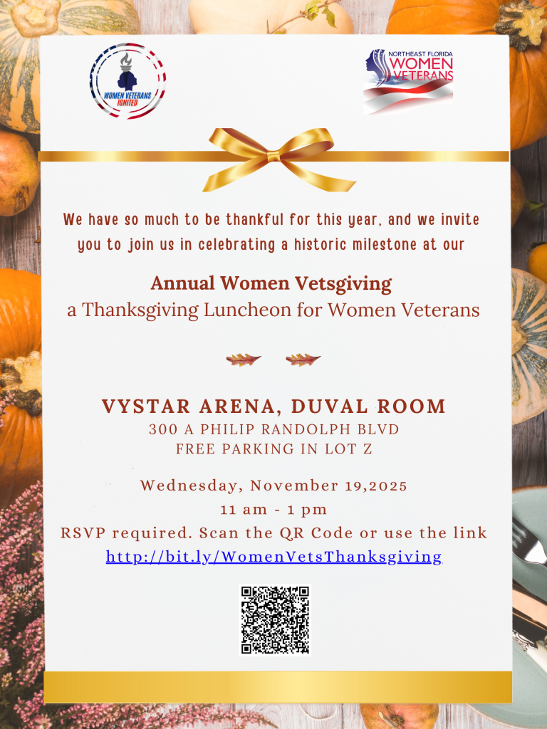 Women Veterans! Please join us for our annual Thanksgiving Luncheon and register ahead at: form.jotform.com/Northeast_Florida/WomenVetsThanksgiving
