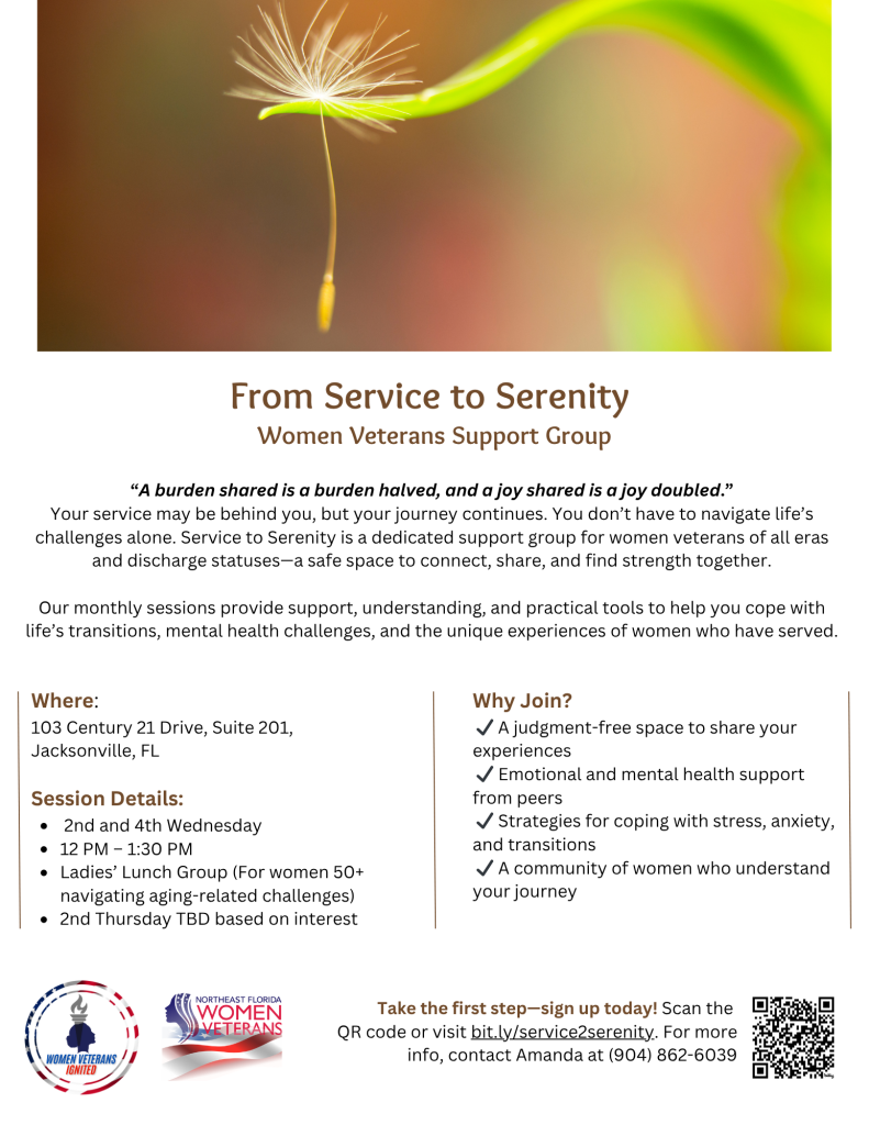 Your service may be behind you, but your journey continues. You don’t have to navigate life’s challenges alone. Service to Serenity is a dedicated support group for women veterans of all eras and discharge statuses—a safe space to connect, share, and find strength together.