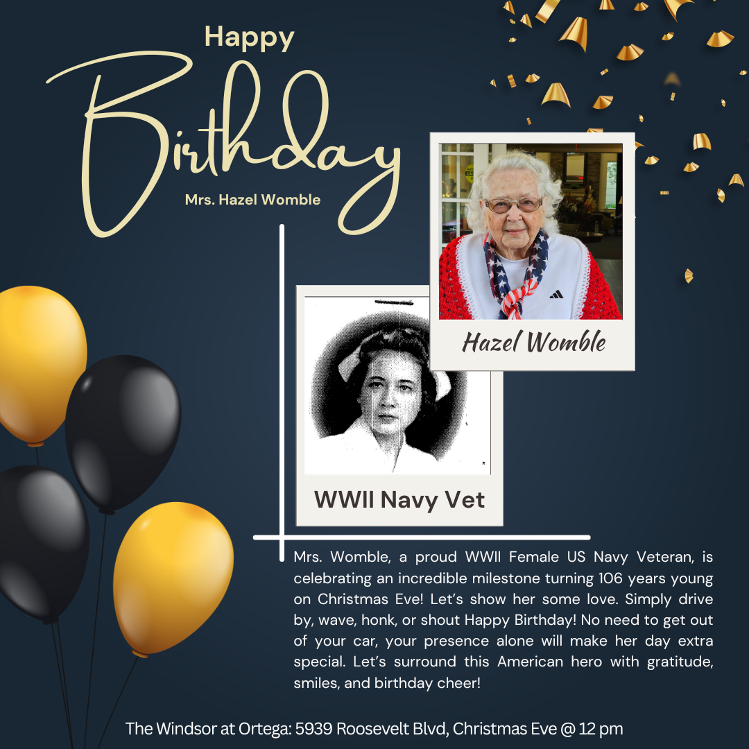 Mrs. Womble, a WWII Female Navy Veteran, turns 106 on Christmas Eve.